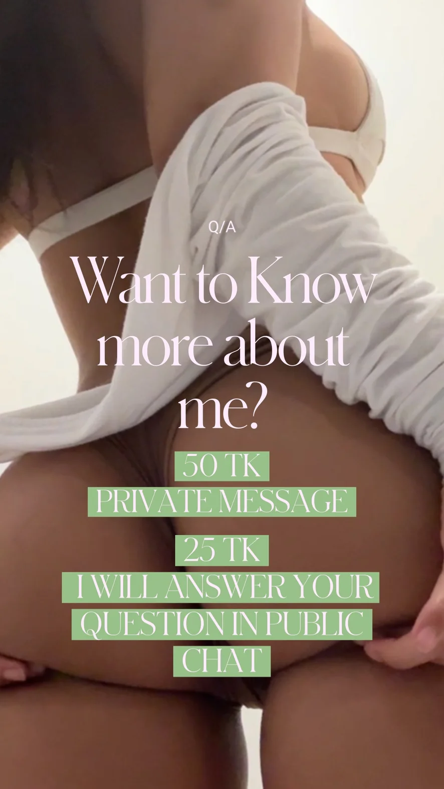 Ahegao, Zezadu, Sprcha, Dildo nebo vibrátor, Footfetish, Hodnocení péra, Masturbace, Olejová show, Sexuální hračky, Plácání po zadku, Striptýz, Nahoře bez, Twerk, Venku, Jóga